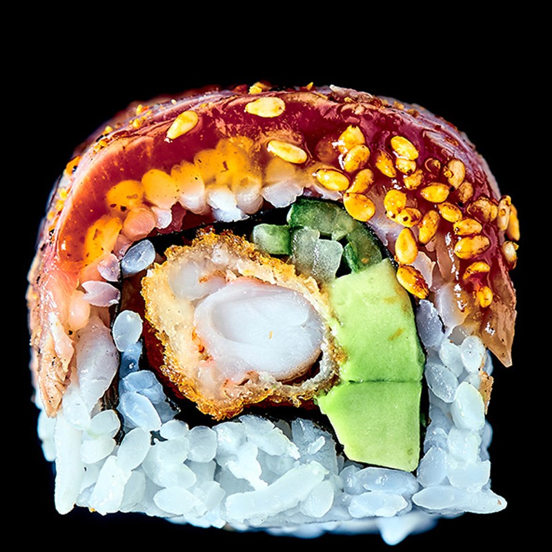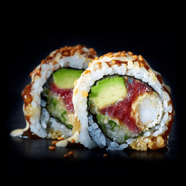 Reis, Tempura-Garnele, Avocado, Gurke, flambierter Yellowfin-Tuna, scharfer Sauerrahm, Teriyaki-Sauce