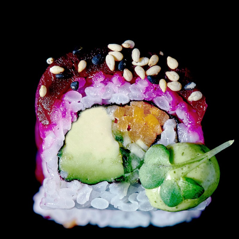 Reis, Avocado, Karotte, Gurke, Shiso-Kresse, Rote Bete, Hulk-Sauce, Sesam