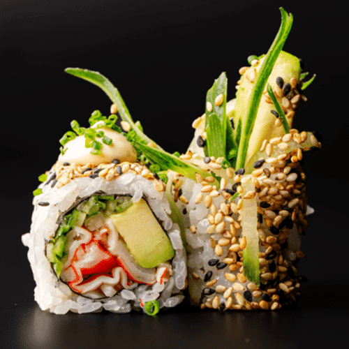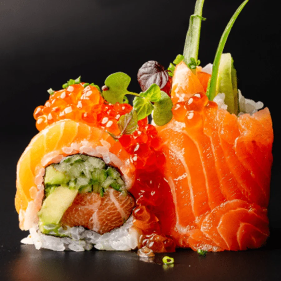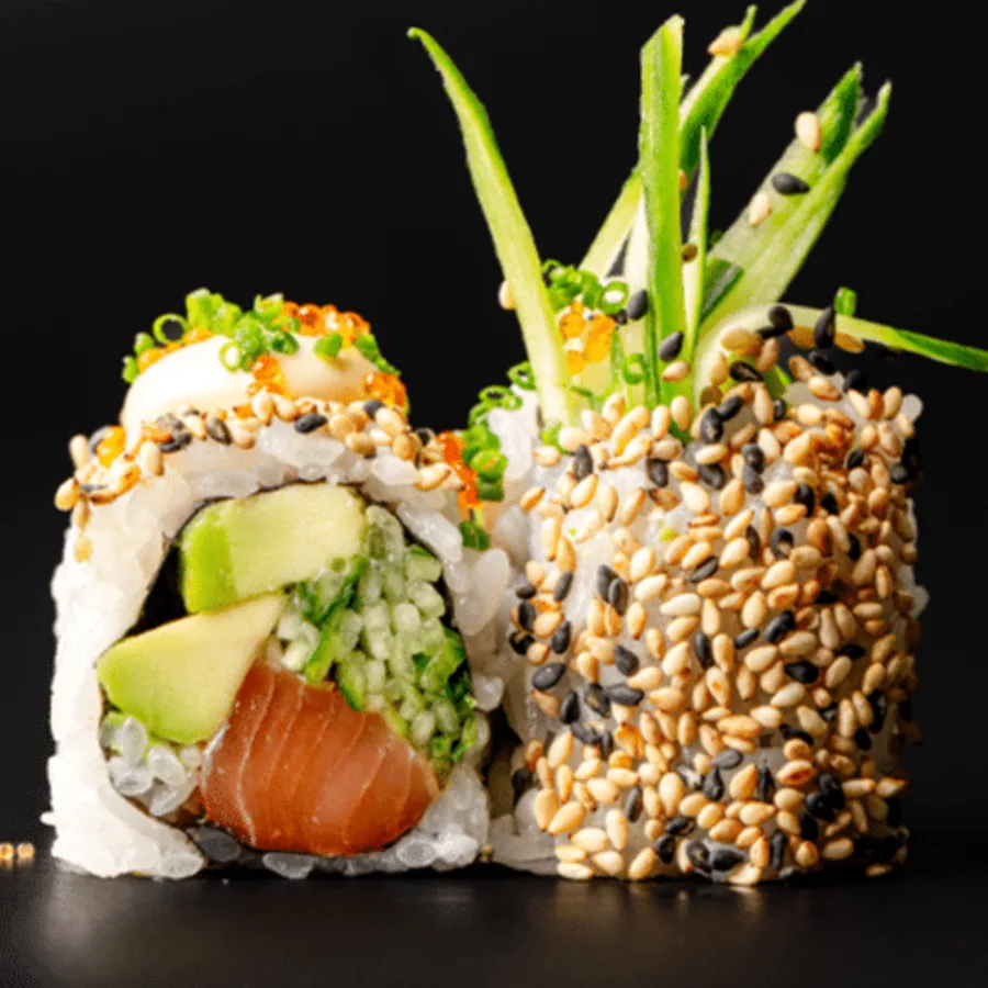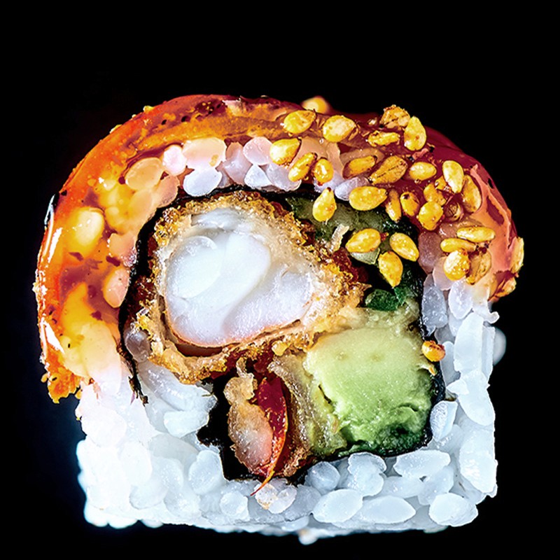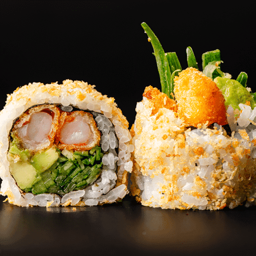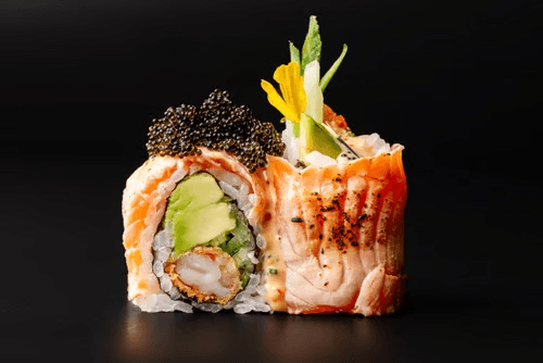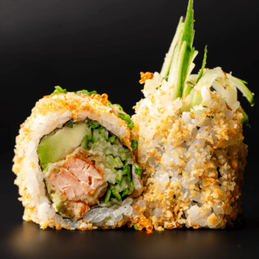 Reis, Nori, Gurke, Avocado, Panko-Garnele, flambierter Lachs, Tobiko-Mayo, schwarzer Tobiko, Kresse