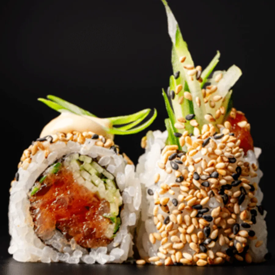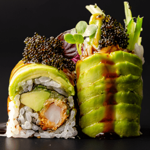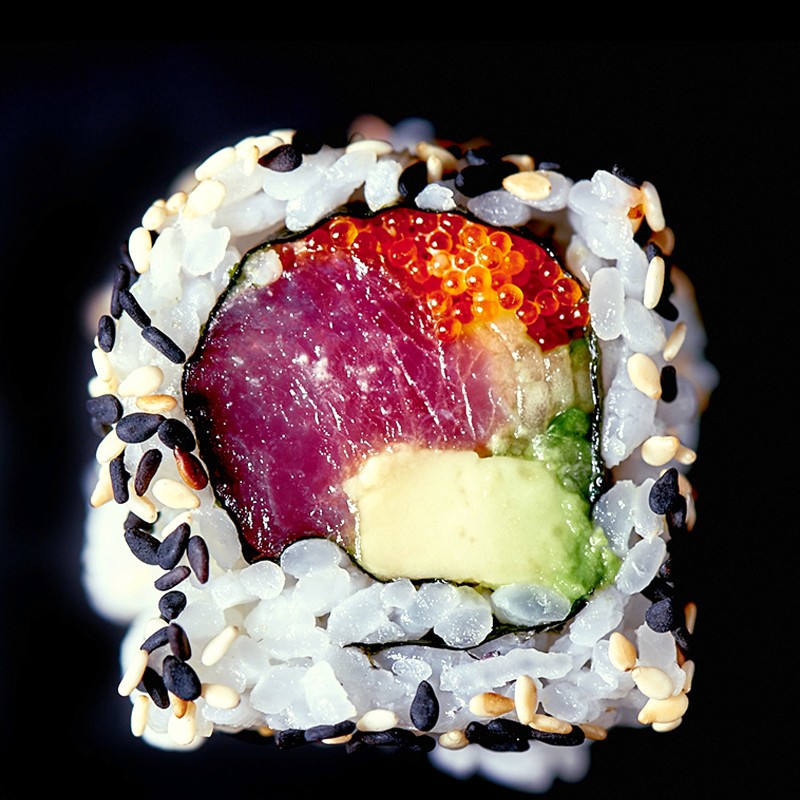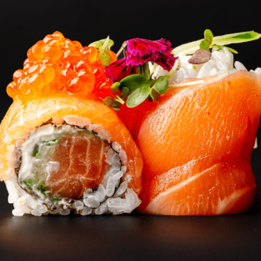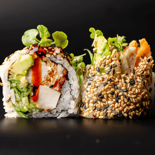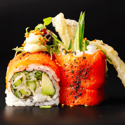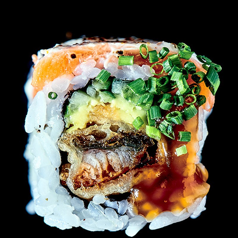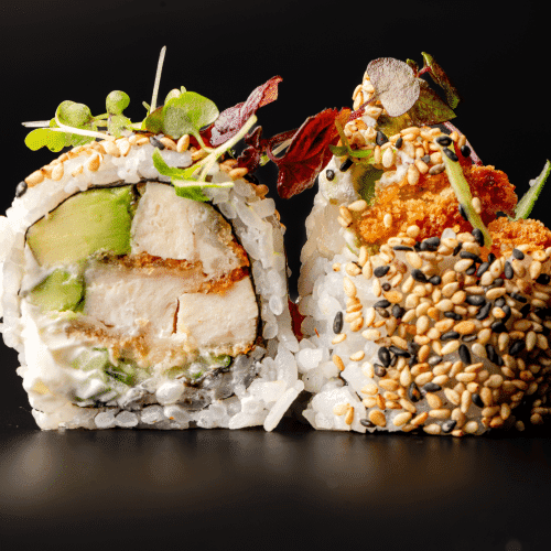 Reis, Nori, Gurke, Avocado, Panko-Garnele, flambierter Lachs, Tobiko-Mayo, schwarzer Tobiko, Kresse