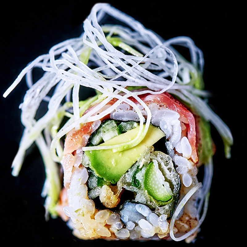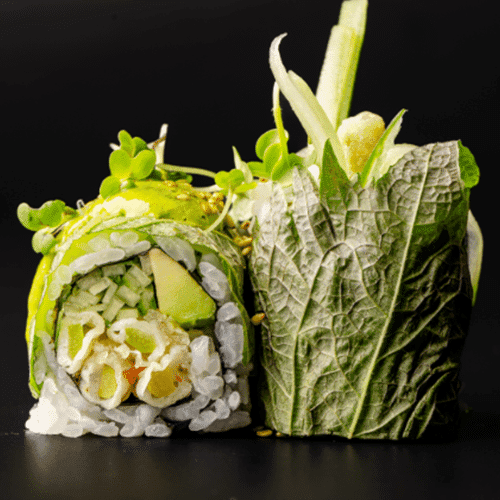 Reis, Nori, Tempura-Spargel, Gurke, Avocado, Shiso- Blatt, Hulk-Sauce, Wasabi-Sesam, Kresse