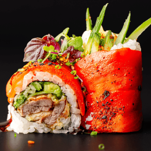 Reis, Nori, Tempura-Garnele, Avocado, Gurke, Premium- Rinderfilet on Top, Spicy Teriyaki-Sauce