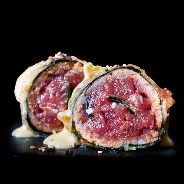 Reis, Nori, Tempura-Spargel, Tempura-Garnele, flambiertes Rinderfilet on Top, Trüffel-Ponzu-Sauce, Nussbutter, Hulk-Sauce